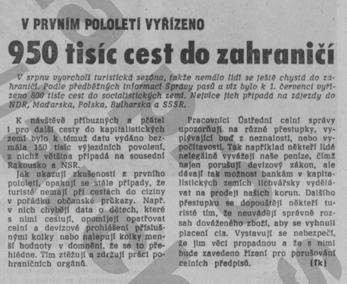 Ale nejen to, hodně se na Západ cestovalo i soukromě tedy turisticky, na tzv. devizový příslib. Jak ukazuje následující článek z Rudého práva, tak jen v roce 1966 bylo těchto šťastlivců na stopadesát tisíc. Nehledě na další, kteří se vydali na námořní plavby, jak dokládá inzerát Čedoku. Ovšem už cena takového zájezdu ve výši asi půlročního průměrného platu naznačuje, že si jej nemohl dovolit každý. Podobně jako na případně přidělené devizy měl jen ten, kdo zastával dobře placené místo, podmíněné legitimací KSČ, plus řezník či zelinář apod.