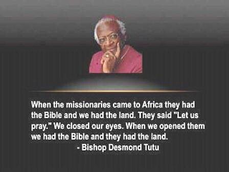 Když misionáři přišli do Afriky, měli bibli a my jsme měli zemi. Řekli „Modleme se.“ Zavřeli jsme oči. Když jsme je otevřeli tak jsme měli bibli a oni měli zemi. –Biskup Desmond Tutu.