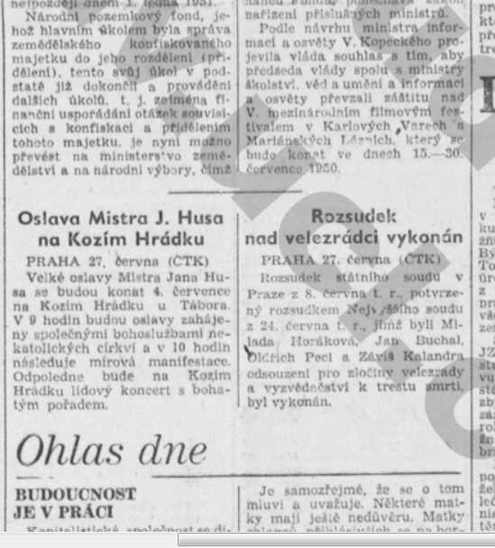 Hned vedle lakonické zprávy o vykonání rozsudku je pak přilepená zprávička o oslavě Mistra Jana Husa. To je další zajímavost, chtěli tak snad soudruzi dát najevo, že když mohla vraždit kacíře církev, můžou oni taky? Nebo jen to, že kdo neposlouchá, zaplatí klidně i životem, a že to platí dnes stejně jako před pěti sty lety? To asi spíš, což potvrzuje i těch několik řádků nad zprávou o Husovi, věnovaných konfiskaci zemědělského majetku. Ty naznačují hlavní důvod toho, proč musela Milada Horáková s přáteli zemřít.