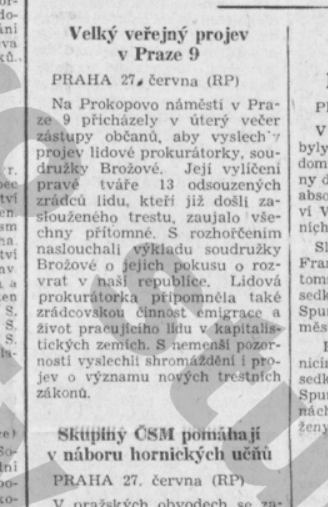 Tady je pro úplnost zmíněný článek s titulkem „Velký veřejný projev v Praze 9“ Škoda jen, že Rudé právo mělo tehdy přece jen omezený rozsah, a tak už nemohlo popsat celou atmosféru vystoupení, na kterém tehdy ještě slečna Brožová jistě rozdávala i autogramy, dost možná i do památníčků školákům, pokud se mohli pochlubit pěkným vysvědčením.