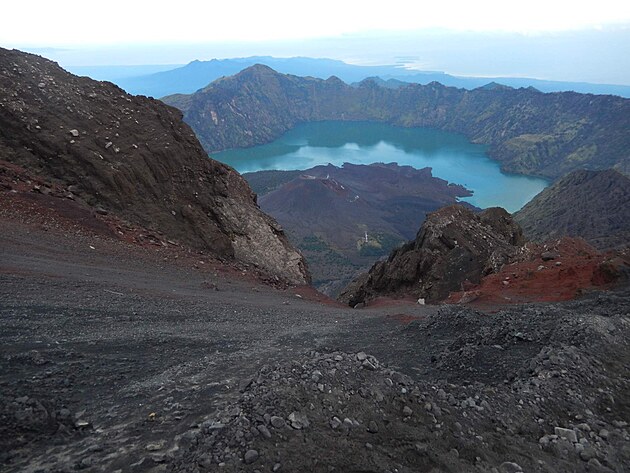 Byla jsem opravdu hodně unavená, jak z brzkého vstávání, tak z výstupu a psychicky jsem byla připravená na slíbený relax. Další trasa vedla dolů ze strmého kopce. Začátek cesty byl plný kamenů a já jsem kopec slézala tak, že jsem si sedla na kus kamene, spustila nohy dolů a zase usedla, spustila nohy a tak dále a tak dále. Byl to sice pomalý způsob, ale v tu chvíli nejméně namáhavý. Většinou mi dělá problém scházet rychle prudké kopce – bojím se, aby se mi na nerovném povrchu nesmekla noha nebo abych si nevyvrtla kotník. Sunula jsem se dolů dost a pomalu, ale můj muž byl trpělivý a čekal na mě. V tu chvíli se mi hlavou honilo „Co na tomhle sakra vidí?!“ Zbytek skupiny se nám ztratil, včetně našeho průvodce. Nijak zvlášť nám to nevadilo, dokud jsme věděli, kudy jít. Pak ale veškeré orientační body i značení zmizelo a jen díky jiné skupince, kterou jsme náhodou potkali, jsme věděli, kudy dál. Konečně jsme prošli údolím a dorazili do nově připraveného tábořiště u jezera Segara Anak. To už jsem byla opravdu dobitá a konečně zula boty.