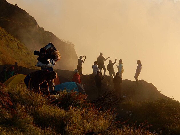 Jak jsme se dostávali výš, nebylo už takové vedro, což jsem ocenila. Chvílemi jsme dokonce šli v „obláčku“, a to bylo po horkém startu celkem příjemné, jenom nám to zabraňovalo ve výhledu do okolí. Konečně jsme po několika hodinách došli do základního tábora na okraji kráteru, kde nám nosiči připravili stany a spacáky a také něco k snědku. Bylo tam asi 16°C, ale Indonésani vypadali, že umrznou a kouřili jednu cigaretu za druhou a popíjeli horkou slazenou kávu. My jsme si došli k nedalekému prameni s (údajně) pitnou vodou doplnit zásoby a pořídili několik nádherných fotek při západu slunce.