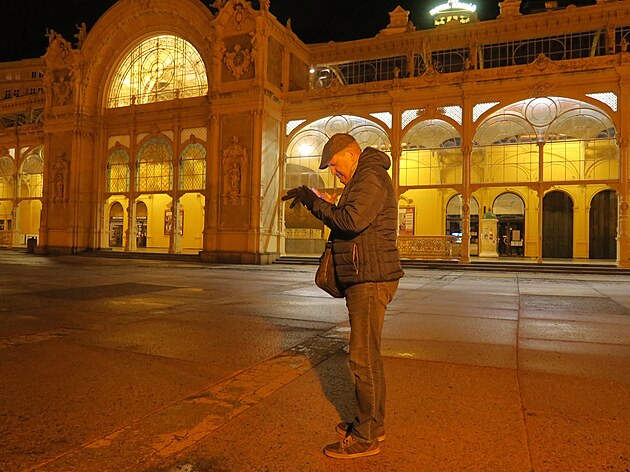 klid i v noci. Zahlédl jsem jediného lázeňského hosta, který se patrně snažil přivolat nějakou společnost.