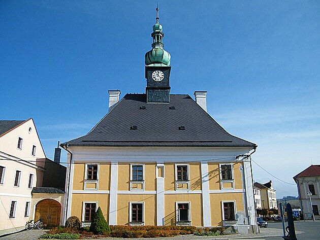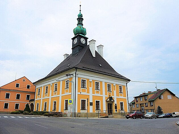 Před touto radnicí František v čele srocení lidu požadoval propuštění pana faráře.
