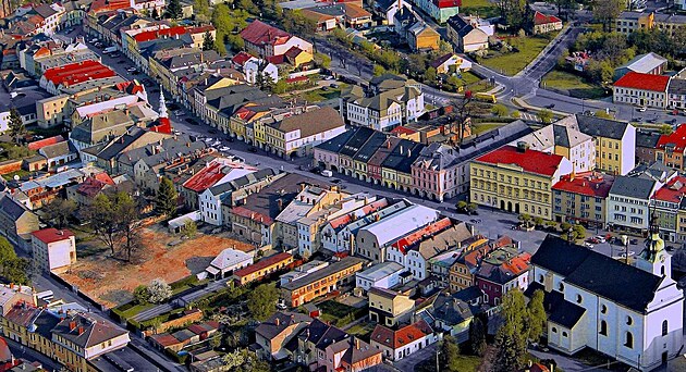 Pojďme do města. Svého času se rozhořel boj mezi Svitavama, Litomyšlí a Telčí, kdo má u nás nejdelší podloubí a šlo doslova o decimetry. Svitavy obsadily první až třetí místo. Tak se na něj mrkněme nejdřív komplet. Foto z letadla laskavě zapůjčil Jiří Zdražil.