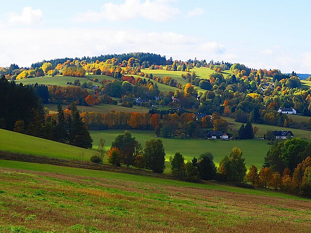 Taky se mu občas podaří vložit do přírody svoje stavení, které celkový ráz nekazí. Vesnická památková rezervace Krátká u Sněžného.