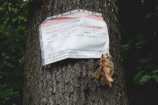 Tato lesní cesta je zdobená různými cedulemi. Na jednom stromě u cesty, v místě, kde si spolu povídají jenom stromy, jsme potkali oznámení o "Přerušení dodávky elektrické energie". Ať jsem se rozhlížela jakkoli po lidském obydlí, našla jsem pouze zbytky dávného oppida.