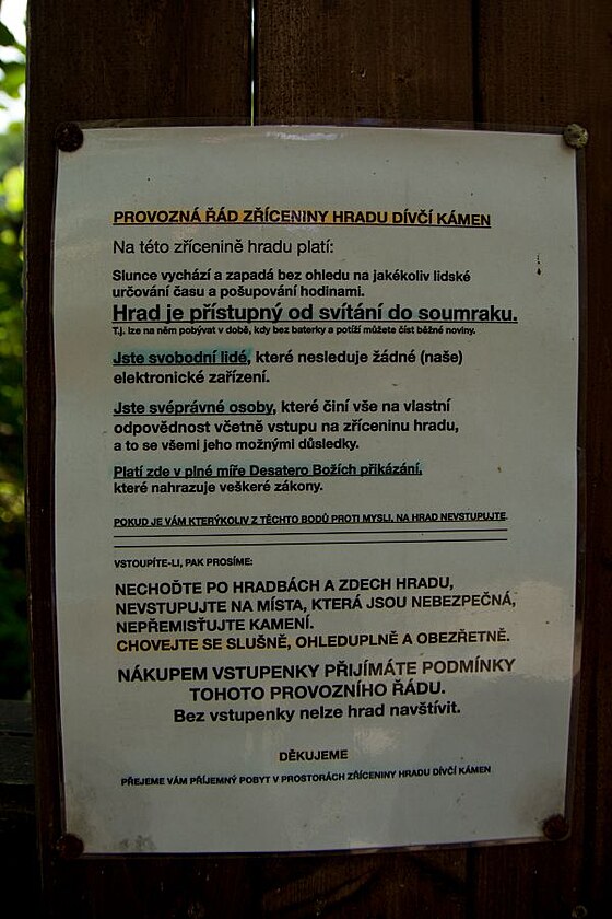 Ten pečlivě dohlíží na každého návštěvníka, zda podrobně prostudoval Provozní řád zříceniny.