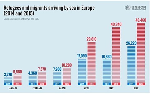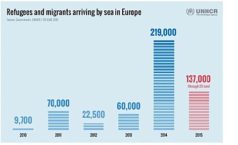 Jaká jsou tedy fakta? Obrázek, jehož zdrojem je Úřad Vysokého komisaře pro uprchlíky OSN, ukazuje vývoj počtu uprchlíků přes moře do jednotlivých středomořských států EU v období od začátku roku 2010 do 29. června 2015: