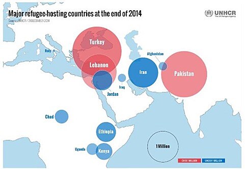 Podle dalšího grafu, rovněž z Úřadu Vysokého komisaře pro uprchlíky OSN, je možno spočítat, že v zemích severovýchodní Afriky a Středního východu bylo na konci roku 2014 přibližně 8 milionů uprchlíků (černě ohraničený kruh v Indickém oceánu představuje svou plochou 1 milion uprchlíků, červené kruhy tento počet přesahují a modré nedosahují, jejich plocha však vždy odpovídá počtu uprchlíků v dané zemi).