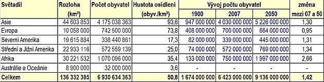 Z tabulky je vidět, že nejhustěji je zalidněná Asie, ale výrazně největší dynamiku růstu populace vykazuje Afrika. Hustota osídlení je zde sice poměrně nízká, ale vezmeme-li v úvahu rozlohu téměř neobydlené Sahary (cca 10 milionů km2) a deštných pralesů, které je v zájmu lidstva uchovat pokud možno alespoň v současném stavu, je hustota osídlení na zbytku plochy již dnes blízká Evropské. Ale zatímco v Africe je očekáván růst populace do roku 2050 na více než dvouapůlnásobek, Evropu čeká jako jediný kontinent úbytek obyvatelstva, a to podle prognóz o 78 milionů, což je zhruba desetinásobek počtu imigrantů v současné době připravených na cestu.