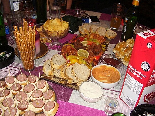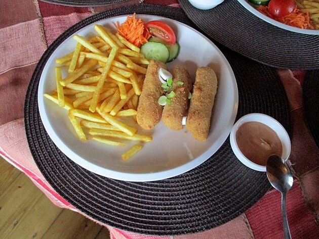 Smažené tvarůžkové tyčinky se šunkou, jen poloviční porce, protože jsou syté. K tomu pálivá omáčka! Ta měla sílu!
