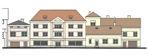 Ve svém návrhu jsem architektonicky upravil krajní rodinný domek a do proluky umístil dvoupatrový obytný dům, s prodejním využitím přízemí. Za ním pak místo garáže ještě jeden menší domek. Je to idealizovaná kompozice, která nebude realizovaná, ale něco by i mohlo posloužit jako inspirace pro budoucí dořešení tohoto prostoru.