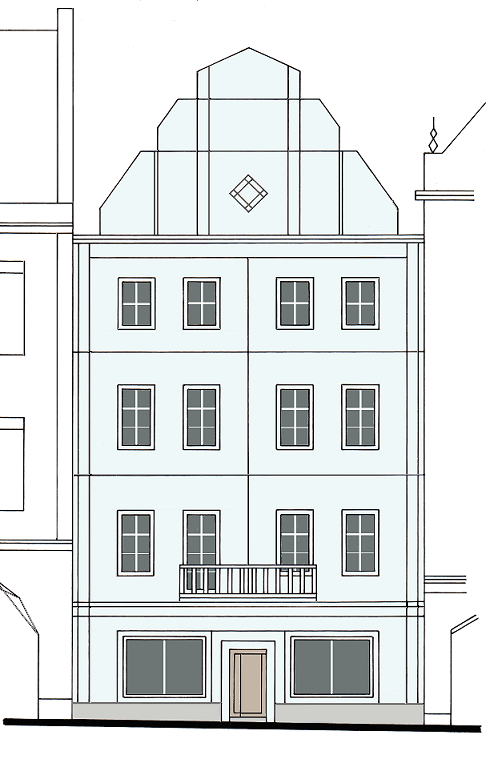 Problém nespočívá v samotné ideové podstatě moderny, ale na tomto místě především v nesprávném urbanismu řešení osmdesátimetrové proluky mezi radniční věží a kostelem sv.Mikuláše jedinou rozměrnou budovou, která měla nahradit velkou Nobileho radnici. Ta sem svými dimenzemi nepatřila. Špatný urbanismus tak nemohl přinést ani dobrou architekturu. Typologie adičně řazených budov zástavby SN si diktuje i zde podobné připojení menších štítových průčelních domů. Dále pak je nutná kontinuální návaznost kultury moderní architektury na historické slohy. Pro porovnání zde opět přikládám pohled na část budov zástavby rynku a svůj tzv. "Modrý dům", druhý v řadě návrhu dostavby proluky jeho západní strany.