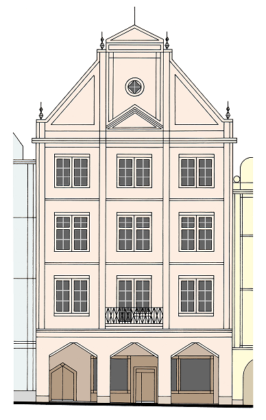 Můžete vaši architekturu trošku více přiblížit? Třeba na příkladu jednoho ze čtyř novým domů pro tuto proluku (průčelí viz níže). Všechny navržené domy vycházejí z urbanistické a architektonické typologie budov náměstí. To znamená, že se jedná o klasický fasádní typ architektury se štítovým průčelím, s plným nebo loubím otevřeným přízemím. U zmíněného příkladu je přízemí otevřené loubím s lomenými oblouky, potom následují tři tradiční podlaží se složenými (sdruženými) okny, umístěn je balkón. Nad nimi je průčelí vyvrcholené dominantním štítem, kryjícím půdu sedlové střechy (vzadu zkosené valbovou). Architektura je symetrická, gradovaná ve vyvážených proporcích, pravidelně členěná svislými a vodorovnými pásky a bohatěji zdobená dalšími prvky ve zkoseném štítu. Ten se vyznačuje trojúhelníkovým, profilovaným frontonem v ose, nad ním je kulaté okýnko, vyvrcholení řešeno obdélníkovým a opět trojúhelníkovým útvarem. Po stranách této střední části štítu probíhají svislé pásky - lisény od prvního patra a další vystupující trojúhelníky zdobení po stranách zkoseného štítu. Pak jsou tu i doplňující drobné hroty - fiálky. Inspirace zde evidentně historickými slohy, ale celkové vyznění architektury je moderní. A o to mi tu šlo, zdvořile se poklonit K.I.Dienzenhoferovi, ale z naší doby a také nepovýšeně ani neponíženě. Rovnocenně a harmonicky v novém urbanisticko-architektonickém zapojení chrámu do obrazu Staroměstského náměstí.