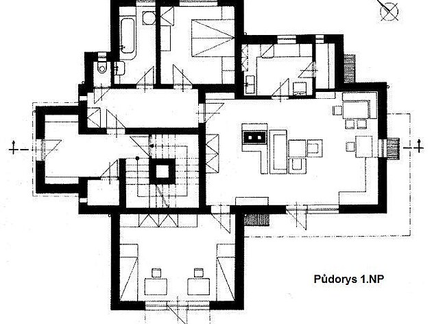 Na zádveří navazuje točité schodiště, které propojuje všechna podlaží domu, a chodba, kde se nachází hygienické zařízení (WC a koupelna). Dále pak následuje ložnice a vstup do hlavního prostoru bytu, společné obytné místnosti. K té přiléhá kuchyně a dětský pokoj. Prosvětlená hlavní obytná místnost slouží také jako jídelní kout. Přízemní byt je navržen jako bezbariérový, se vstupem z obou obytných místností do zahrady. Oddělení WC a koupelny od obytného a jídelního prostoru pokládám za vhodné (dva odpady jsou běžné). Průchod do dětského pokoje přes společnou místnost zde také nepovažuji za chybné řešení (vhodná jsou i jiná bytová řešení).