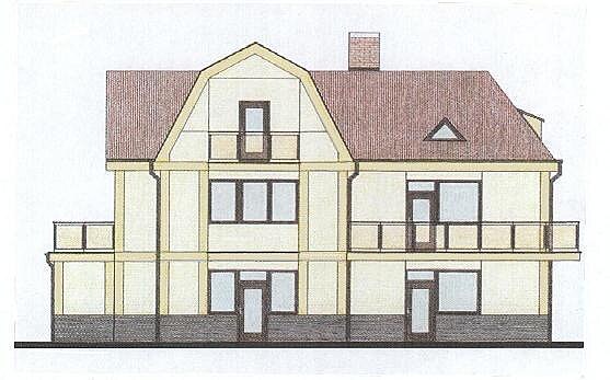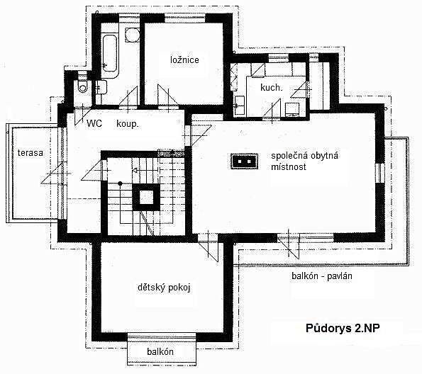 Byt ve 2.NP je navržen stejně, do venkovního prostoru se rozšiřuje terasou nad zádveřím a balkóny z obou obytných místností (pavlán).