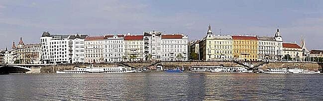 Kostel P.Marie kláštera Na Slovanech (v Emauzích) se na tomto obrázku uplatňuje jen nenápadně, na jiných panoramatických záběrech a bližších pohledech ovšem vyniká architektonický omyl, kterého se dopustila rekonstrukce v 60.letech. Tento gotický kostel byl, stejně jako dům nahrazený Tančícím domem, vybombardován v r.1945. Ale o návrhu na novou rekonstrukci jeho průčelí až příště.