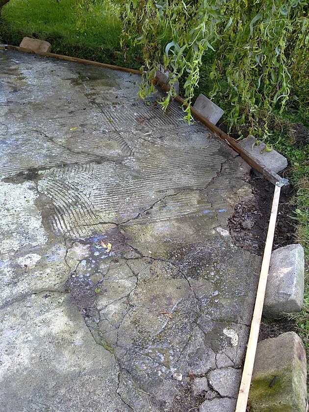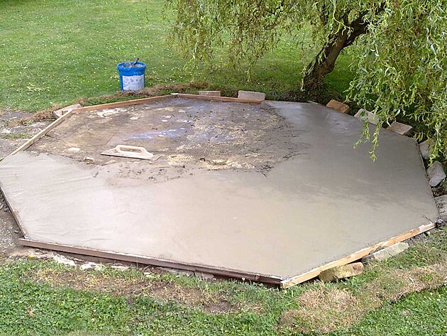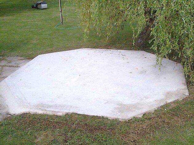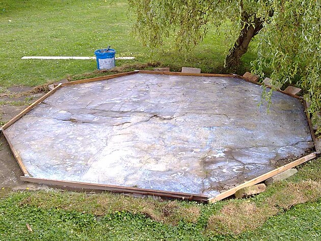 Lití tohoto betonu proběhlo již před několika lety za účelem co nejméně poškozovat zakoupený bazének. Pod betonem se však časem propadla hlína a tak místo přestalo být použivatelné. Zde je krátká fotodokumentace, jak se místo zrenovovalo.