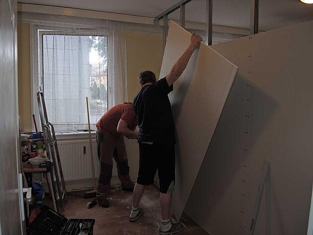 Na jednoduchou kovovou konstrukci se přišroubují sádrokartonové desky. Nevím jestli by byl veliký rozdíl použít obyčejné, ale my jsme se rozhodli připlatit a pořídit akustické, aby se místnosti od sebe lépe zvukově odizolovaly. Práce se dá zvládnout i v jednom, ale ve dvou to jde mnohem rychleji. Desky jsme pokládaly rovnou na podlahu.