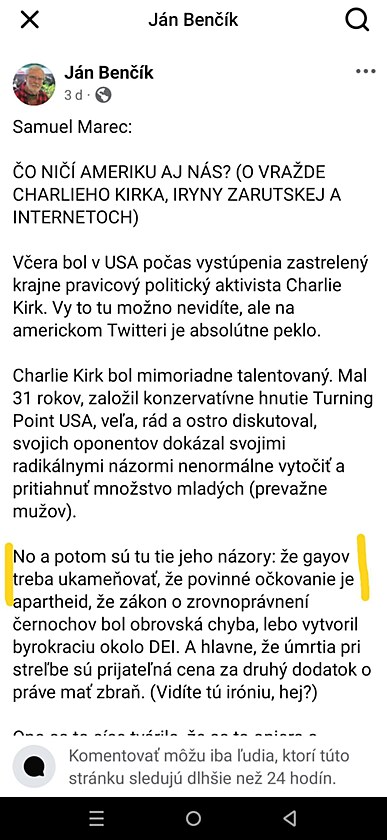 Až na to, že to je lož. Charlie Kirk nikdy nepovedal, že gejov treba kameňovať. Veď jedným z jeho priateľov bol Dave Rubin, muž ktorý žije v partnerstve s iným mužom. Nie je čudné, že teraz verejne smúti za Kirkom, ktorý ho údajne chcel ukameňovať? Túto lož zverejnil Stephen King, ktorý má milióny sledovateľov. Keď ho upozornili na to, že to je lož, komentár zmazal a verejne sa ospravedlnil. Preto Samo Marec túto časť aj neskôr potichu bez ospravedlnenia zmazal, ale najprv si dosť dlhú chvíľu počkal, kým si to stovky ľudí skopíruje a bude šíriť, vrátane exposlanca Jána Benčíka, ktorý to na facebooku šíri doteraz. Nemyslíte si, že odstránenie vraha gejov je pre spoločnosť dobré?