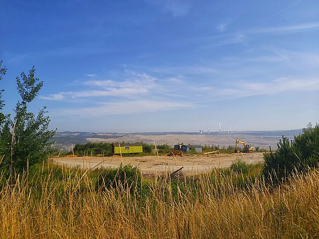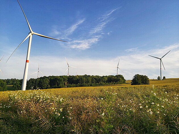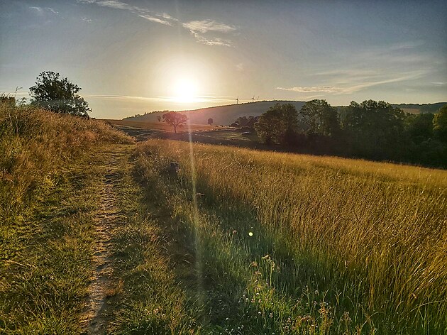 Slunce se vyhouplo nad obzor ve chvíli, kdy jsem asfalt opustila a šla po pěšině podél hranice. Za sebou jsem nechala Lysý vrch s větrnými elektrárnami, po pravé ruce jsem měla zbytky větrného mlýna a před sebou další skupinu větrných elektráren. Začínala jsem si na ně zvykat.
