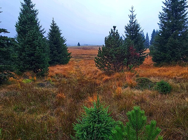 Údolí mě chvilku chránilo před větrem, nahoře se do mě ale vítr opřel plnou silou. Krajina se rozestoupila, vítr zesílil, po pláni honil cáry mlhy, pršelo, teplota jen lehce nad nulou. Tak tohle byly ty pravé Krušné hory! Počasí testovalo moje vybavení, ale mě to bavilo.