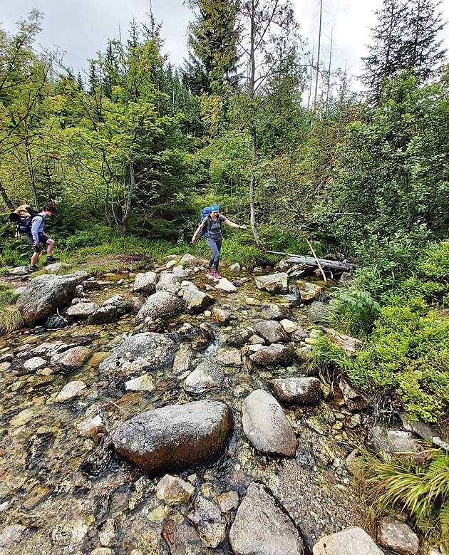 Další cesta byla parádní. V našem směru už turisté nepokračovali, měli jsme ji jen pro sebe. Nejprve strmě dolů po kamenném moři. Pak po chodníčku a nakonec pěšinkami po neznačených cestách. Na to jsem se už dlouho těšila. Občas nějaký ten močálek nebo cesta přes potok. Rozhodně to nebyla nuda. Dcerka vtipně poznamenala, že tahle cestovka tedy nic moc. Ubytování mizerné, snídaně malá, oběd žádný, cesta blátivá. Bavilo nás to všechny.