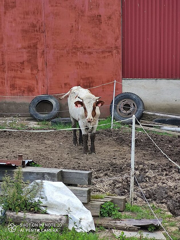 Druhý den jsme s manželem šli na policii ve Velkém Meziříčí, nechtěli nás ani pustit dovnitř, chtěla jsem napsat trestní oznámení na SVS-KVS Jihlava, zamítli mi to, prý se musím objednat. Žádala jsem tedy, aby zvířatům pomohli, šli se podívat na místo a zakročili. Po dlouhém přemlouvání se tam s námi jeli policisté podívat. Dovedli jsme je do stáje, kde majitel týral zakrslou jalovici č. 447377 961 (možná krávu) a trýznil zakrslého býka č. 813080 061, kterému tekla z tlamy pěna, několikrát jsem na to policisty upozornila a zdůrazňovala jsem, že za vraty stáje na dvorečku bez vody a krmení jsou další zvířata. Dalo se to obejít po obecní cestě a odtud by mohli situaci zkontrolovat a nafotit, ale neudělali to. Podvyživený býk č. 813083 061 na dvorku na tom byl hodně špatně, byl dehydrovaný, i další zvířata očividně trpěla. Osobně jsem měla strach tam jít, aby mě majitel nenapadl.