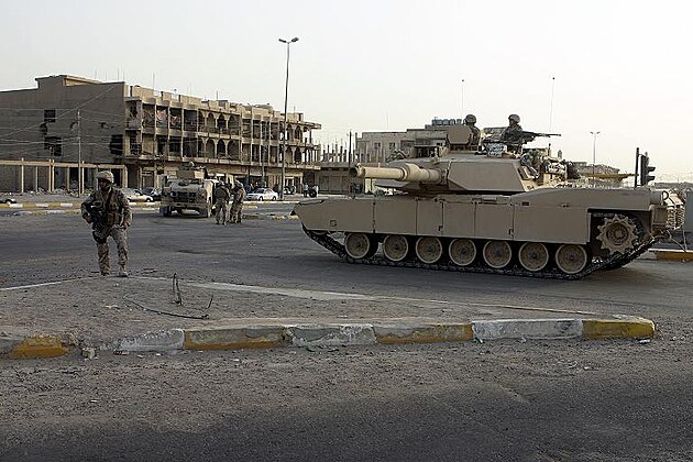 Tank M1 Abrams na předměstí Bagdádu. V pozadí vlevo vůz Humvee.