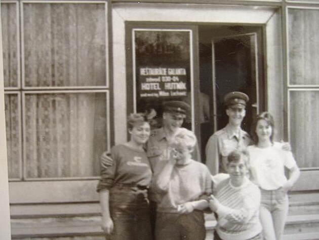 Na fotce jsem já (jsem ten vpravo) s kámošem Rosťou (za rok mu vojín Kalai prostřelí stehno při vypáskovávání zásobníků), naše mámy, Rosti slečna a moje tehdy budoucí a nyní bývalá žena. Před hotelem Hutník - Sereď, okres Galanta, poddůstojnická škola - 2.5.1987.