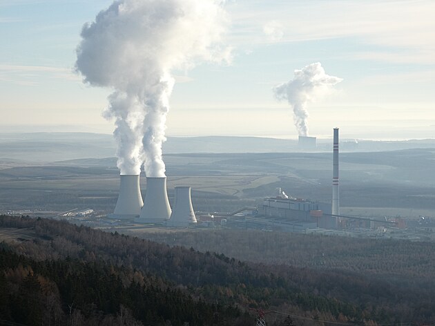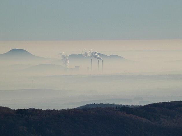 Z jiného kopce je zase vidět Prunéřovská dvojka. Chladící věže v pozadí jsou Tušimice.