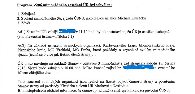 Bohužel znovuzvolený předseda z nepochopitelných důvodů, aniž by počkal na registraci našeho sjezdu (15.6.) na ministerstvu vnitra, napsal Michalovi Klusáčkovi aby mu vrátil razítko předsedy, protože byl zvolen předsedou. V té době ministerstvo vnitra už zaregistrovalo, za našimi zády, Klusáčkův sjezd. Michal Klusáček nelenil a poslal ministerstvu dopis, v kterém nás lživě označil jako bývalé členy, protože jsem neměli zaplatit příspěvky.