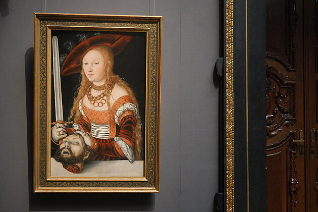 Sťatá hlava Goliáša[8], Judita s Holofernesovou hlavou[9]. Salome s hlavou Jána Krstiteľa (pre istotu hneď vo viacerých variáciách), to je už horšie ako „Salome, sťali už Křtitele, Salome, usměj se vesele Točíš se ve víru, ústa jak upíru, Krví ti planou, Salome ... Noci už ubývá, císař se usmívá, Pokojně mohu žít, všeho lze použít, Pro dobrý stát, Možná ho napadlo prastaré říkadlo, Dějiny když tvoří se, pro hlavy na míse, Nemá se štkát“[10]. Kryl to povedal piesňou, tu máte všetko na obrazoch. Naturálne, realisticky, s kvapkajúcou krvou. Pozerateľné aj pre slabšie povahy? Asi áno, ale ak by sa to objavilo v televízii, nechýbalo by poučenie: Nevhodné pre citlivých ľudí a maloletých divákov.