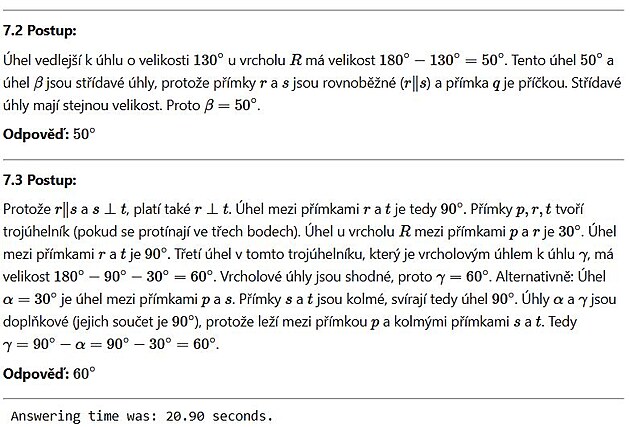 K řešení této úlohy na úhly je porozumění obrázku naopak stěžejní. Předložený výsledek je od Gemini 2.5 Pro Preview, který na úloze pravidelně s třetí podotázkou též selhává (má být 140°). Flash 2.0 zde vyřeší 0 až 2 podotázky, přičemž se mu chyba vyskytuje různě, snad podle toho, jak situaci právě konceptuálně vnitřně pojal.