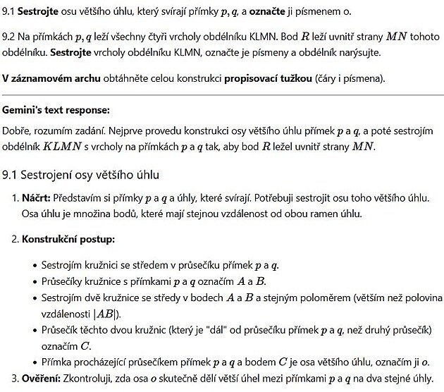 Gemini Pro 2.5 jsem využíval různé podverze, podle toho, co API právě dovolilo používat. Škobrtlo částečně (ale opakovatelně) na úlohách 7 a 11 v prvním testu, a 12 v druhém. Kromě toho též vždy na konstrukční geometrii, z důvodů již výše zmíněných. Úlohy 9 a 10 jsem proto prozatím kontumačně vzdal, a odepsal 5-6 bodů. Přesto dokázal opakovaně test skládat na 42-43 bodů z 50. Což je výsledek, který by v Praze mohl stačit na gymnázium, byť ne nutně na ta nejžádanější. Podle použité subverze z 2.5 test trval 5-7 minut.