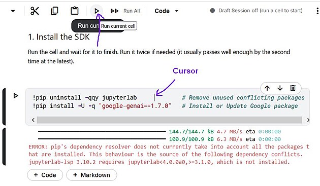 1. Install the SDK. Toto je asi jediná buňka, která občas zlobí. Vždy se nejprve umístí kursor dovnitř buňky s kódem, kterou chcete spustit. Následně se buňka spustí tučnou šipkou doprava v horní liště. Viz obrázek: