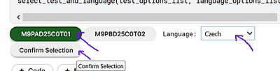 Zvolil jsem první test, pak jazyk „Czech“ a završil „Confirm Selection“.
