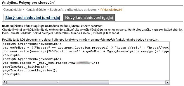 7/ Musíte vybrat "Nový kód sledování" (ga.js)". Starý kód sledování (urchin.js) má méně funkcí. Zkopírujete tedy "Nový kód sledování" a vložíte do zdrojového kódu svých stránek. A opět dáte "Pokračovat".