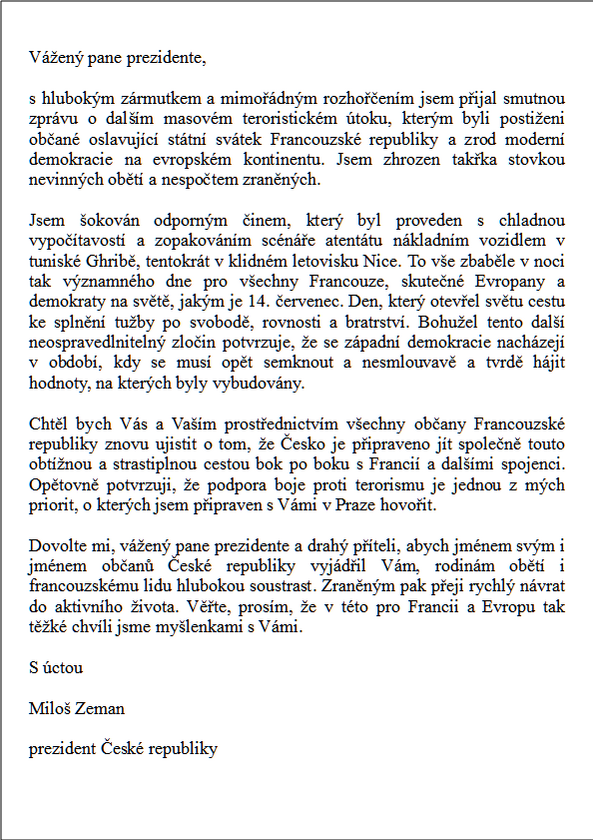 Svět však okamžitě zalila vlna zděšení a soucitu a ze všech zemí Amerikou počínaje a Ruskem konče chodila vyjádření soucitu a lítosti. Především jsem však zaznamenal jakési náznaky výzev k jednotnosti. A to i od politiků, kteří obyčejně stojí jaksi proti sobě. Americký prezident Obama okamžitě nařídil americkým úřadům, aby poskytly Francii veškerou pomoc. "Pro vítězství nad tímto hrůzostrašným zlem je nutno spojit úsilí celého civilizovaného lidstva, důsledně a nekompromisně bojovat se všemi formami a projevy terorismu." nechal se naopak slyšet ruský prezident Putin, který zároveň potvrdil, že Rusko je připraveno na co nejužší spolupráci s Francií i jinými mezinárodními partnery ve všech směrech protiteroristické činnosti. Z domácí scény pak jako příklad uvádím slova jaksi hlav taktéž nesmiřitelných, a tedy prohlášení Bohuslava Sobotky na jeho facebookovém profilu a přepis dopisu prezidenta Zemana adresovaného francouzskému prezidentu Hollandovi.