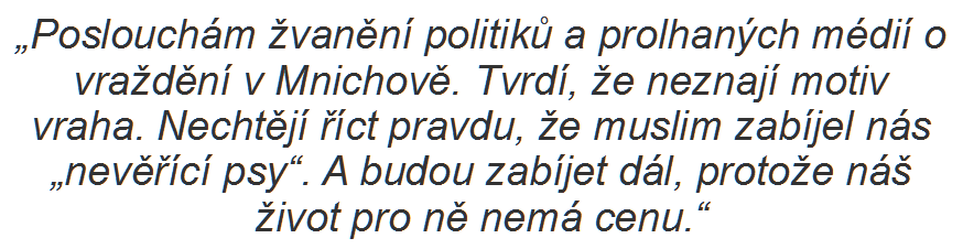 Zajímavé je však především, že ono vyjádření soustrasti zabralo v celém tří a půl minutovém videu plném nenávistných a obviňujících projevů pouze deset sekund. Po zbytek řeči pak pouze kštil síru na premiéra Sobotku, Andreje Babiše, "servilní" vládu a Brusel, vyzýval k vystoupení z Evropské Unie a rozséval nenávist vůči jiným náboženstvím a kulturám. Člověk by si onoho strohého projevení soustrasti popravdě ani nevšiml, kdyby si vlog pana Okamury ve snaze nešířit bludy nepustil dvakrát. Člověku by se až zdálo, že pan Okamura na podobné události čeká jako na příležitost, jak se na vlně rostoucí nenávisti vynést do výšin. Že by to byl hyenismus? Vždyť ani po útocích v Mnichově se s výjimkou jedné neuvážené hlavy od krajně pravicové AfD (která si následně vysloužila posměch) neuvolil žádný politik těžit na tomto neštěstí. Pan Okamura však neváhá a opět začíná s nepodloženým obviňováním, jen aby vytěžil co nejvíce na tomto velikém neštěstí. Je sice zcela jasné, že útočník s radikálním "islamismem" neměl vůbec nic společného, a snad právě ze strachu, aby se k němu IS také nepřihlásilo či za člena této teroristické organizace nebyl mylně považován, vyřvával "Já jsem Němec." Ale i přesto Tomio Okamura opět mluví o prolhaných médiích a vraždících muslimech.