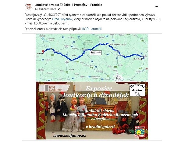 Osobně jsem měl na starost místnost č.4 "Youtubeři minulosti", kterou jsem vybavil 11 divadélky a 63 loutkami ze své sbírky, která byla různorodě spjatá s prostějovskem. Tato místnost byla poslední z dané výstavy a předcházely jí průchozí místnosti „Jak se rodí loutka“ s místním řezbářem, „Jak se staví pohádka“ s 4 pódii pro minipohádky místního sokolského loutkového divadla Pronitka a vstupní místnosti s dílničkami pro děti pro tvorbu vlastních loutek „Nazdárek Kašpárek, hurá do pohádek“.