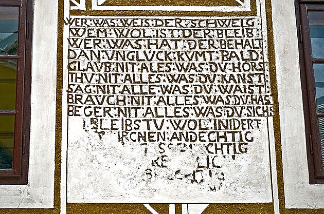 Jaké asi mohly být nápisy před staletími, když prostí lidé neuměli číst, znázorňuje fasáda jednoho z letitých domů v Rybářské ulici v Českém Krumlově. Středověká moralita realizovaná technikou sgrafita.