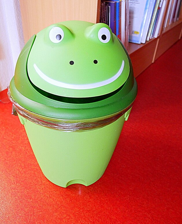 Poslala jsem ho k našemu odpadkovému koši ve tvaru žáby. Těm úplně mrňavým návštěvníkům knihovny, když dostanou za odměnu bonbónek a rozhlížejí se, kam by vyhodili papírek, říkám: „Nakrm s ním žábu“. A oni ke koši nadšeně utíkají, protože je tento způsob likvidování odpadu baví.