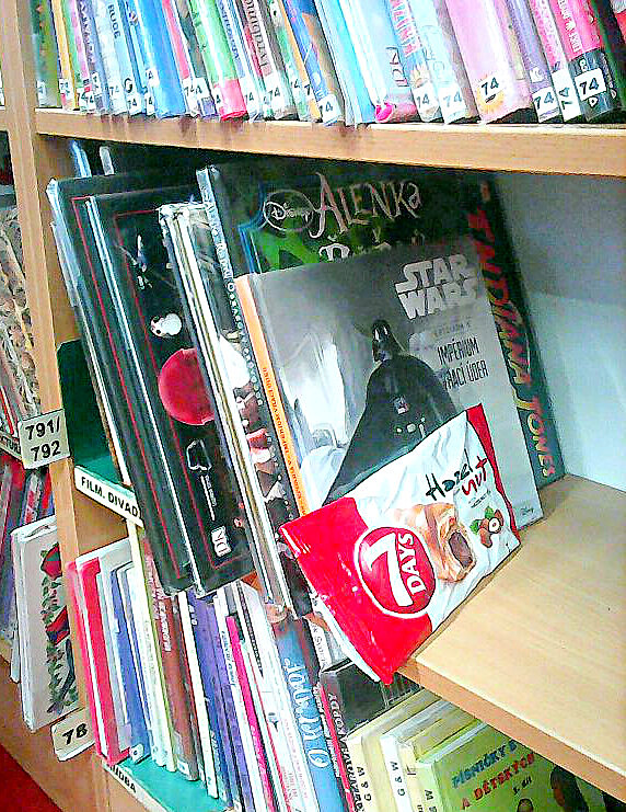 A v knihovně se nám knihovnicím a knihovníkům často stává, že nám čtenáři buď chtějí ušetřit kroky, nebo nás zaměstnali nějakým požadavkem, který zrovna pro ně řešíme, tak abychom se nezdržovali úklidem knížky, kterou zrovna vracejí, nabídnou se, že knihu do regálu zařadí sami. „To je dobrý, já vím, kam ta knížka patří,“ uklidňují nás a vypůjčenou knihu zařadí skutečně přesně tam, kam podle nich správně pasuje. Nu, a když se kolem poledne knihovna vylidní a knihovnice popadne stohy vrácených a zatím nezařazených knih, tak se u regálku, kam ochotná čtenářka knihu před chvílí zařadila, nestačí divit. Nevím, jak v takové situaci reagují ostatní kolegyně, ale já jsem propadla smíchu a honem jsem si to vyfotila: