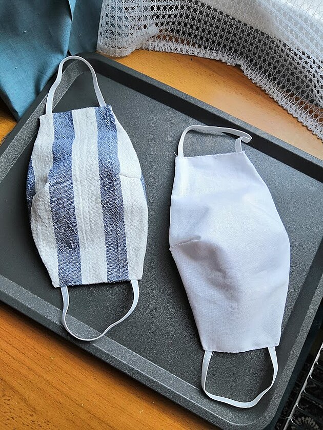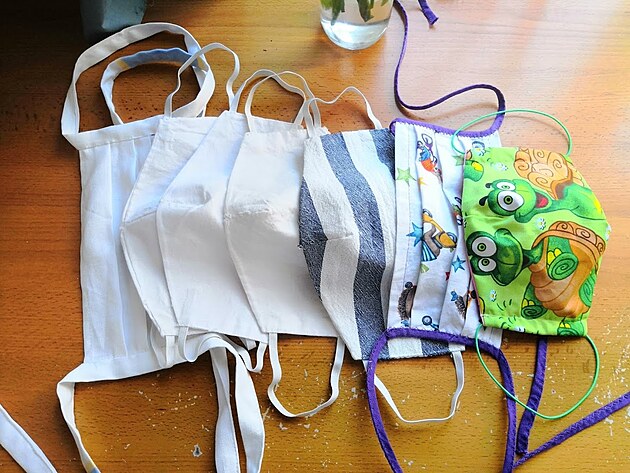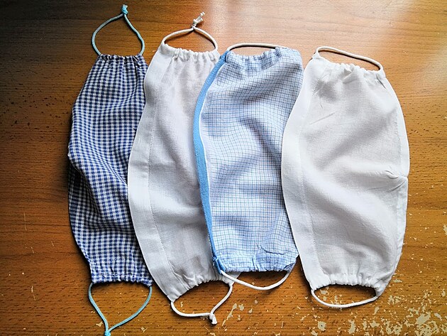Kapesníkové roušky vlastní výroby, tzv. letní model. Z každého kapesníku jsou dva kousky.