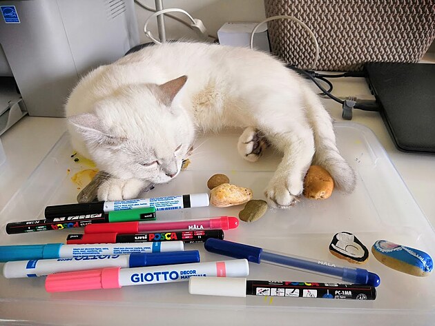 Zná mě dokonale. Spí se mnou, poctivě sedí před sprcháčem, na záchod se mnou chodí, vaří se mnou, kamínky maluje, píše, prádlo věší. Jeden by řekl, že je to spíš pejsek než kocourek.